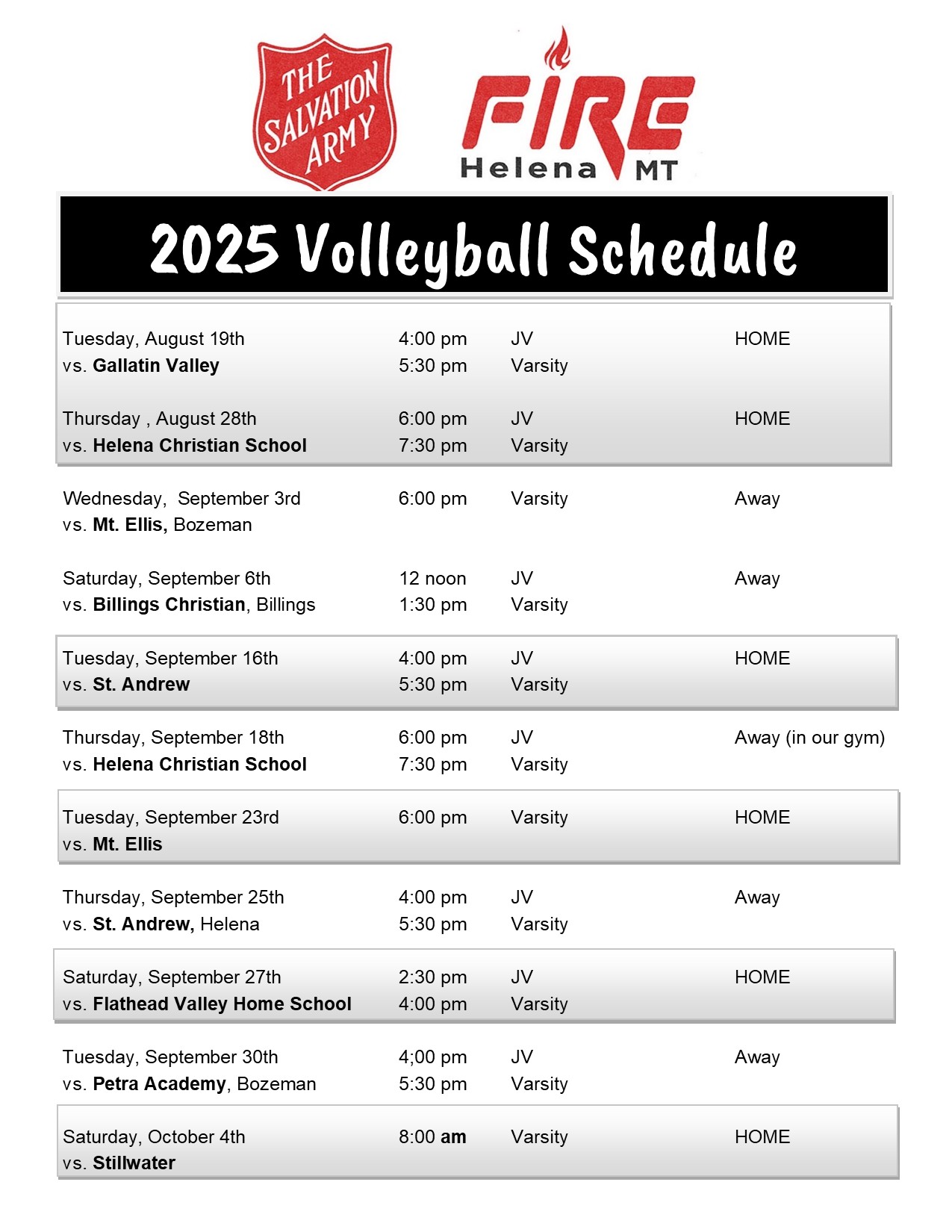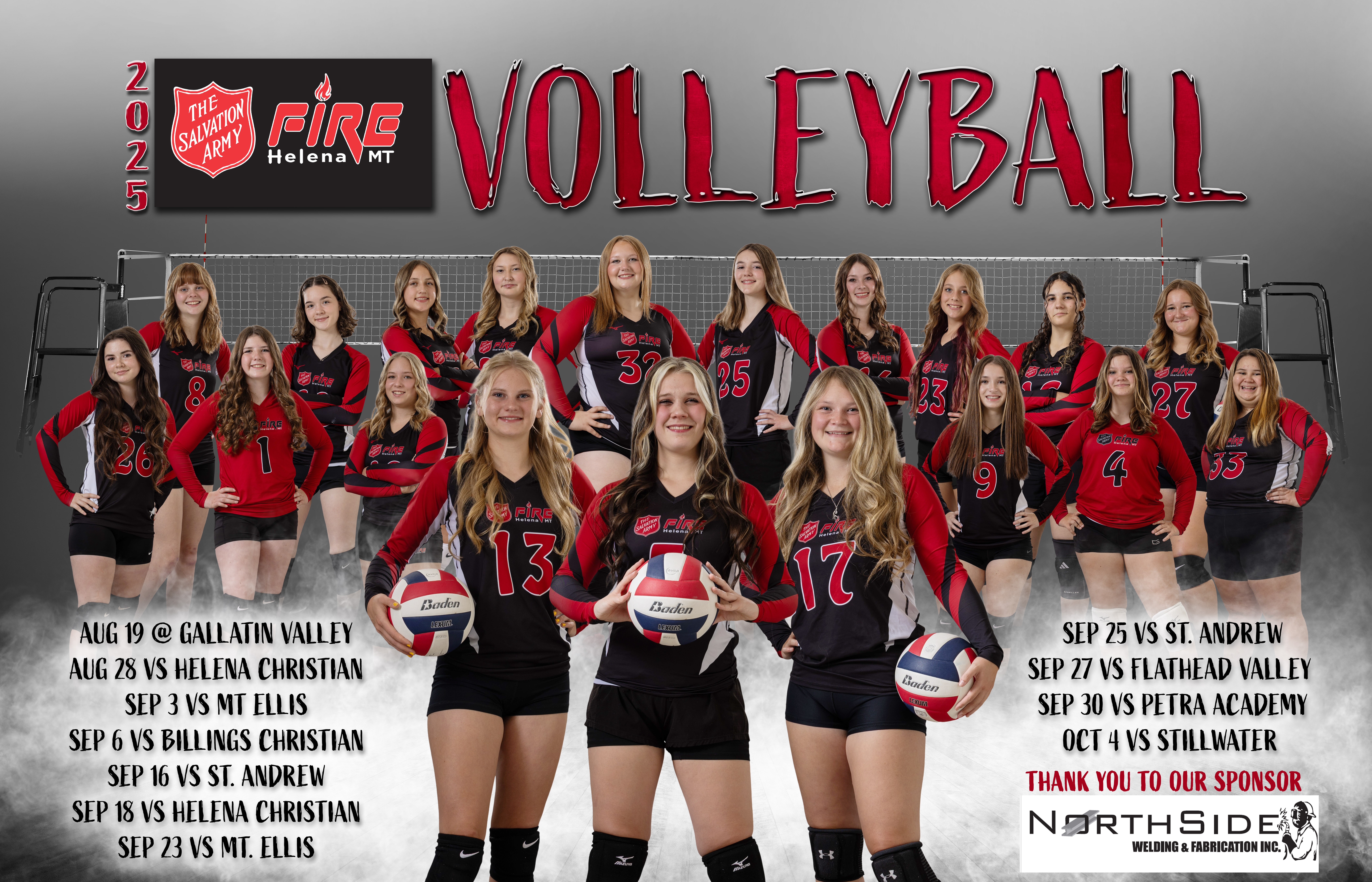 Parents, Students or Fans you will find the information needed to be involved with our FIRE Athletics program. We are a competitive team with games against Home schools and Christian schools across Montana. We are currently offering Fall Volleyball for High School Girls and High School Boys Basketball in the Winter. We would like to add High School Girls Basketball for the 2025-2026 season. If you have interest in any of our Fire Athletics programs or future offerings, please contact Phil McGovern our Athletics Director at Phil.McGovern@usw.salvationarmy.org or Text him at 406-439-7556.